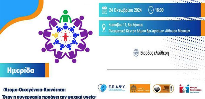 Η Αντιδημαρχία Κοινωνικής Πολιτικής και Πρωτοβάθμιας Υγείας του Δήμου Βριλησσίων, σε συνεργασία με το Κέντρο Κοινότητας του Δήμου μας και την Εταιρεία Περιφερειακής Ανάπτυξης και Ψυχικής Υγείας (ΕΠΑΨΥ), διοργανώνουν ημερίδα με θέμα: «Άτομο – Οικογένεια –Κοινότητα: όταν η συνεργασία προάγει την ψυχική υγεία».