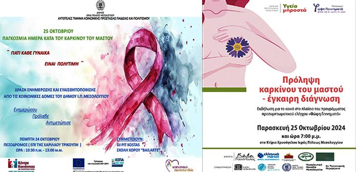 Επιπλέον διοργανώνεται για το ίδιο θέμα εκδήλωση, στο πλαίσιο του προγράμματος προσυμπτωματικού ελέγχου «Φώφη Γεννηματά», από το Γενικό Νοσοκομείο Μεσολογγίου που τελεί υπό την αιγίδα του Δήμου Ιερής Πόλης Μεσολογγίου και της Περιφέρειας Δυτικής Ελλάδας, την Παρασκευή, 25 Οκτωβρίου στις 19:000 στο Κτίριο Χρυσόγελου (Μεσολόγγι).