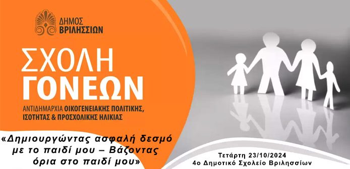 Με το βιωματικό εργαστήριο «Δημιουργώντας ασφαλή δεσμό με το παιδί μου – Βάζοντας όρια στο παιδί μου» συνεχίζονται οι συναντήσεις της Σχολής Γονέων του Δήμου Βριλησσίων την Τετάρτη 23/10/2024 στο 4ο Δημοτικό Σχολείο Βριλησσίων στη συμβολή των οδών Τειρεσίου και Σπάρτης και ώρα 18:00-20:00.