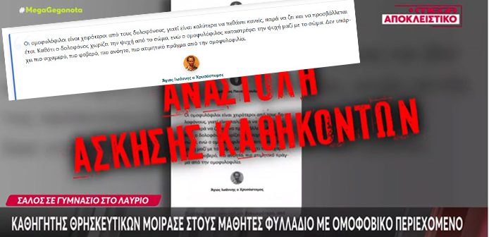 Σάλο έχει προκαλέσει φυλλάδιο με ομοφοβικές και ακραίες αναφορές που μοίρασε καθηγητής Θρησκευτικών σε μαθητές Γυμνασίου στην περιοχή της Ανατολικής Αττικής.