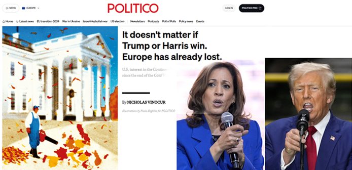 - Διαβάστε από το πρωτότυπο την ανάλυση του δημοσιογράφου Nicholas Vinocur, στο αμερικάνικο περιοδικό Politico, με τίτλο «Politico analysis: why Europe is the big loser regardless of Harris or Trump» και υπότιτλο «Why the November 5 election result does not matter – How the US has shown in every way that it does not care about Europe», πατώντας ΕΔΩ