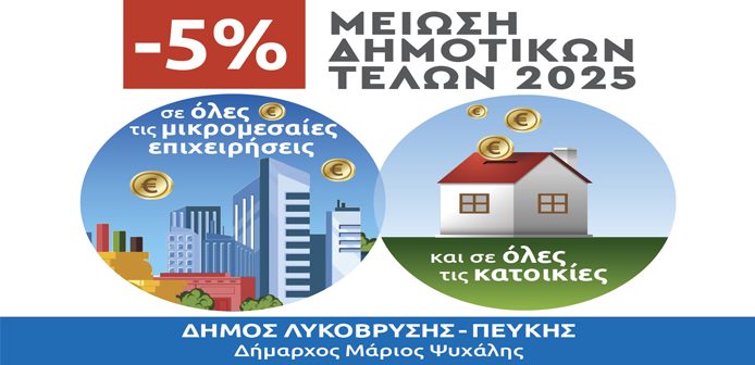 Ο Δήμος Λυκόβρυσης – Πεύκης, «παρά τις σημαντικές αυξήσεις σε βασικά κόστη όπως η ηλεκτρική ενέργεια, τα καύσιμα, το τέλος ταφής απορριμμάτων και το μισθολογικό κόστος», προχωρά σε μείωση των Δημοτικών Τελών για το 2025 κατά 5%, για κατοικίες και μικρομεσαίες επιχειρήσεις
