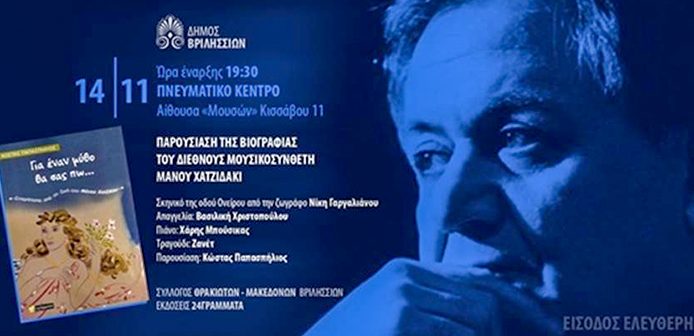 Η βιογραφία του μεγάλου μας μουσικοσυνθέτη Μάνου Χατζηδάκι δια χειρός του διακεκριμένου Βριλησσιώτη συγγραφέα Κώστα Παπασπήλιου παρουσιάζεται την Πέμπτη 14 Νοεμβρίου και ώρα 19:30 στην αίθουσα «Μουσών» του Πνευματικού Κέντρου Βριλησσίων στην οδό Κισσάβου 11.