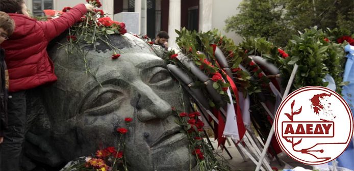 Η Εκτελεστική Επιτροπή της Α.Δ.Ε.Δ.Υ. σας καλεί να συμμετέχετε μαζικά και αγωνιστικά στις εκδηλώσεις τιμής και μνήμης για τους ηρωικούς αγωνιστές της εξέγερσης της 17ης Νοέμβρη 1973, καθώς και στην πορεία που θα πραγματοποιηθεί την Κυριακή 17 Νοεμβρίου 2024, προς την Αμερικανική Πρεσβεία (συγκέντρωση ώρα 15.30, στην Πλατεία Κλαυθμώνος), αλλά και στις εκδηλώσεις μνήμης σε άλλες πόλεις της χώρας.