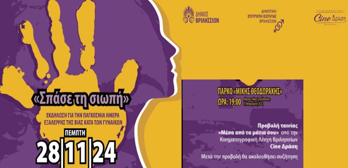 Η Επιτροπή Ισότητας του Δήμου Βριλησσίων και το Cine Δράση σας προσκαλούν την Πέμπτη 28/11/2024 στις 19:00 στην αίθουσα Ν. Εγγονόπουλος στο πάρκο Μ. Θεοδωράκης (πρ. ΤΥΠΕΤ), Π. Μπακογιάννη 38-42 σε μια εκδήλωση με στόχο την ενημέρωση και την ευαισθητοποίηση των συμπολιτών μας για ένα φαινόμενο που περιλαμβάνει όλες τις δυνατές εκφάνσεις της βίας, κάθε μορφή άμεσης φυσικής βίας, τη λεκτική βία, κάθε είδους εξαναγκασμό αλλά και τη συμβολική βία. Από τη γυναικοκτονία, τη συστηματική κακοποίηση, τον βιασμό, τη σεξουαλική παρενόχληση, έως τις διακρίσεις, την αναπαραγωγή έμφυλων στερεοτύπων, τους άρρητους περιορισμούς/αποκλεισμούς από την αγορά εργασίας, η βία κατά των γυναικών αποτελεί παράβαση των θεμελιωδών Ανθρωπίνων Δικαιωμάτων. Τα στοιχεία σοκάρουν. Το 2024 μετράμε 13 γυναικοκτονίες στην Ελλάδα, ενώ οι αρχές καταγράφουν 62 περιστατικά ενδοοικογενειακής βίας κατά μέσο όρο κάθε ημέρα αυτής της χρόνιας και προχωρούν καθημερινά κατά μέσο όρο σε 38 συλλήψεις. Στα Βριλήσσια το πρώτο εξάμηνο του 2024 έχουν καταγραφεί συνολικά 26 περιστατικά ενδοοικογενειακής βίας.