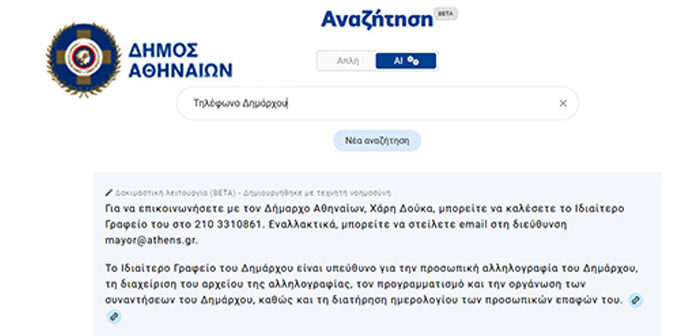Ο Δήμος Αθηναίων, μέσω της ΔΑΕΜ Α.Ε., ανακοινώνει την έναρξη μιας σημαντικής συνεργασίας με τη Google, με στόχο την ενσωμάτωση καινοτόμων τεχνολογιών Τεχνητής Νοημοσύνης (AI) στην επίσημη ιστοσελίδα του, www.cityofathens.gr. Στο πλαίσιο της συνεργασίας αυτής, η Google θα παρέχει στον Δήμο Αθηναίων μια νέα, προηγμένη μηχανή αναζήτησης, η οποία θα αξιοποιεί την Τεχνητή Νοημοσύνη για να προσφέρει στους δημότες μια βελτιστοποιημένη εμπειρία χρήσης και εύκολη πρόσβαση σε πληροφορίες.