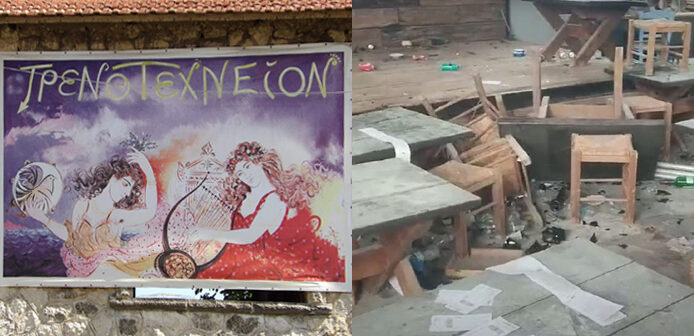 Αυτόν τον χώρο άγνωστοι έβαλαν «στο μάτι» και με πρωτοφανή μανία βάλθηκαν να τον ισοπεδώσουν. Σπασμένες καρέκλες, τραπέζια, μουσικά όργανα, μπουκάλια, κάδρα, αφίσες, CD, αρχεία, πυροσβεστήρες, ποτήρια, τα πάντα παραδομένα στη μανία αυτών των ανεγκέφαλων.