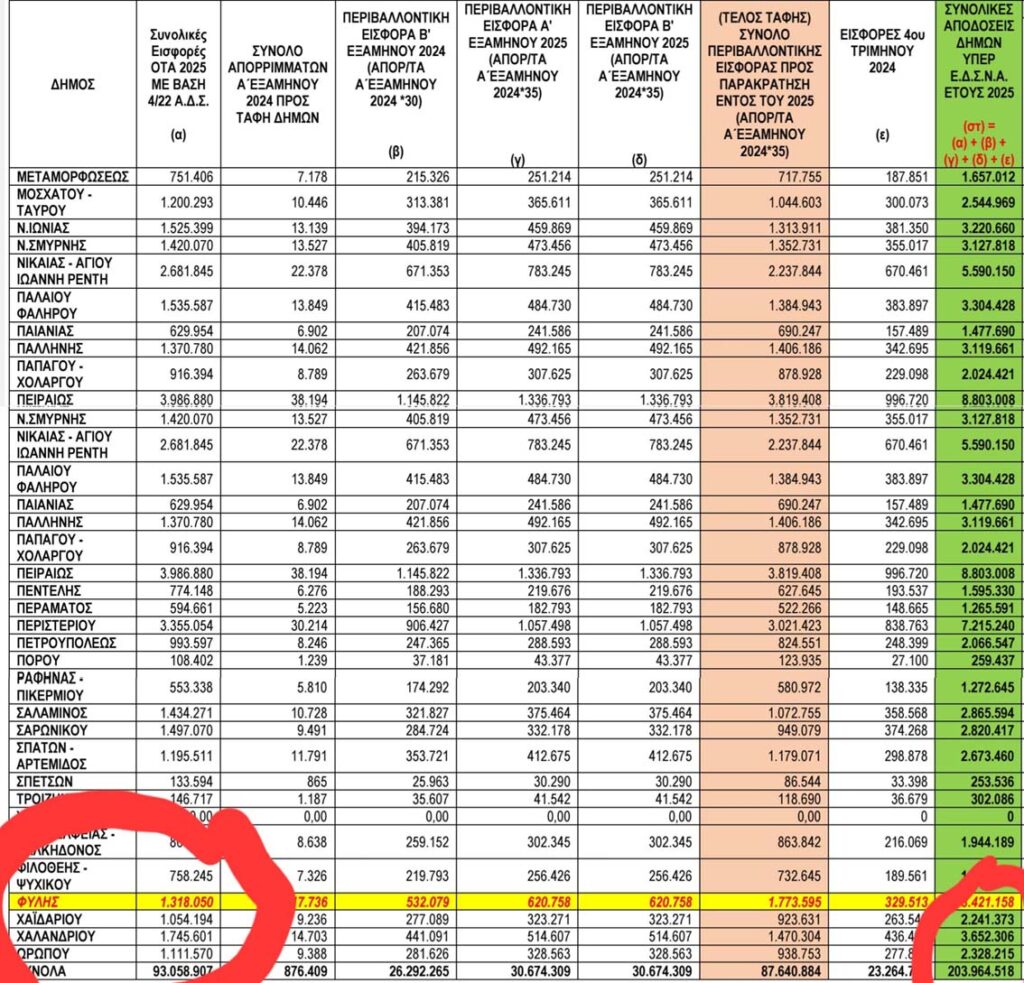 Όποιος έχει την υπομονή να συγκρίνει την πρώτη στήλη που αναγράφει τα ποσά ανά δήμο του 2024 και την πράσινη στήλη με τα ποσά ανά δήμο το 2025 ζαλίζεται από το μέγεθος των αυξήσεων.