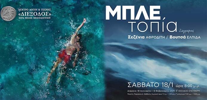 Δύο καταξιωμένες σύγχρονες καλλιτέχνιδες, η Αφροδίτη Σεζένια και η Ελπίδα Βουτσά, εγκαινιάζουν για τον νέο χρόνο τις εικαστικές δραστηριότητες της «Διεξόδου» στο Μεσολόγγι, με μία κοινή τους έκθεση ζωγραφικής που φέρει τον τίτλο «Μπλε τοπία» αφού σε όλα σχεδόν τα έργα τους κυριαρχεί το χρώμα της θάλασσας και του ορίζοντα.