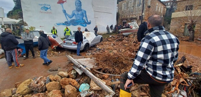 Η μεγάλη ποσότητα νερού που κατέβηκε από το ρέμα της περιοχής προς την πλατεία του χωριού παρέσυρε οχήματα και κάποια τρέιλερ με βάρκες, μεταφέροντας φερτά υλικά και βάρκες που είχαν εγκαταλειφθεί στην κοίτη του.