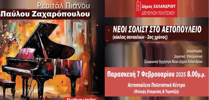 Με το ρεσιτάλ πιάνου του Παύλου Ζαχαρόπουλου, την Παρασκευή 7 Φεβρουαρίου, στις 8 μ.μ., στο Αετοπούλειο Πολιτιστικό Κέντρο (Τομπάζη 18 & Φιλικής Εταιρείας) εγκαινιάζονται οι συναυλίες του 2ου κύκλου «Νέοι σολίστ στο Αετοπούλειο», που διοργανώνουν η Συμφωνική Ορχήστρα Νέων Δήμου Χαλανδρίου και η Δημοτική Φιλαρμονική.