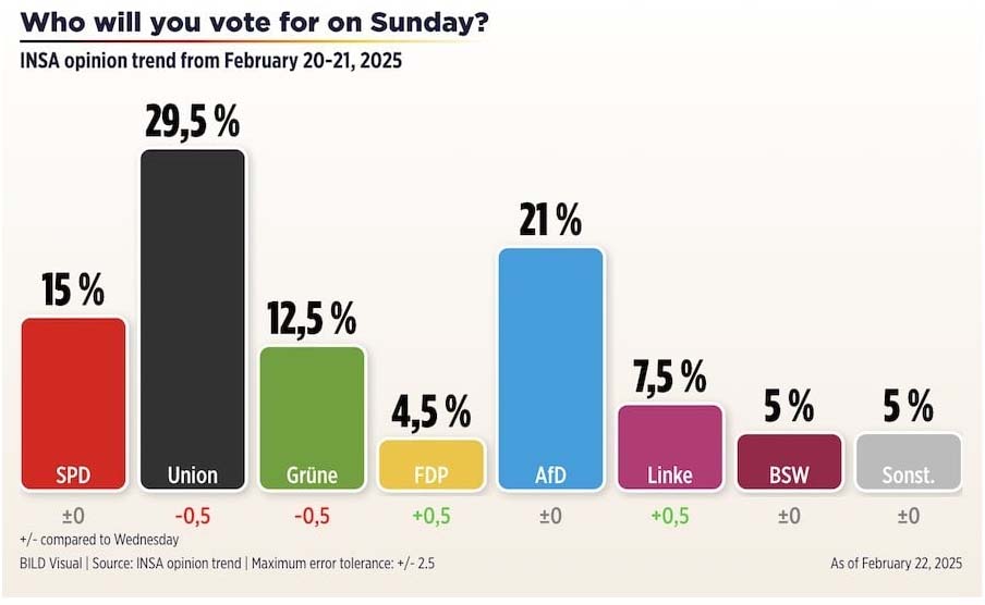 Την έκπληξη, σύμφωνα με τη δημοσκόπηση, θα μπορούσε να κάνει η Αριστερά, δηλαδή το Die Linke. Στην τελευταία δημοσκόπηση, έλαβε 7,5% – περίπου τρεις μονάδες περισσότερο από ό,τι το 2021. Ο επικεφαλής του INSA Hermann Binkert δήλωσε στην «Bild» το εξής: «Το κόμμα της Αριστεράς είναι ο μεγάλος νικητής της προεκλογικής εκστρατείας. Έχει ξεπεράσει ξεκάθαρα το φράγμα του 5%». Σύμφωνα με την έρευνα του INSA, οι Πράσινοι (GRÜNE) του Ρόμπερτ Χάμπεκ (Robert Habeck), συγκεντρώνουν μόλις 12,5%, χαμηλότερα από το 2021 που το ποσοστό τους ήταν 14,8%.