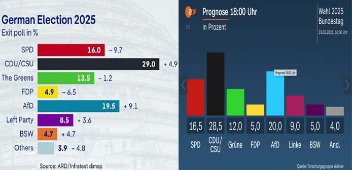 Τα exit poll δείχνουν ότι οι συντηρητικοί του ηγέτη της αντιπολίτευσης Φρίντριχ Μερτς προηγούνται στις εθνικές εκλογές της Γερμανίας. Υποδεικνύουν ότι η Εναλλακτική για τη Γερμανία (AfD) οδεύει προς την ισχυρότερη εμφάνιση ενός ακροδεξιού κόμματος από τον Β’ Παγκόσμιο Πόλεμο.