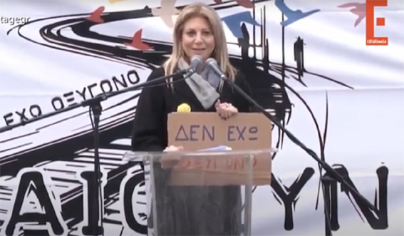 «Ήρθα να πω τον πόνο μου και βρήκα μεγαλύτερο. Εγώ το παιδί μου το νεκροφίλησα. Πως άντεξαν αυτές τις μανάδες εδώ να θάψουν ένα κάρβουνο, ένα ρολόι… Μαρία μου (κοιτώντας την Μ. Καρυστιανού), αν μπορώ να πάρω λίγο από τον πόνο σου… Γιατί εγώ θα αντέξω. Ευχαριστώ που αγαπήσατε την Κυριακή μου σαν να ήταν δικό σας παιδί».