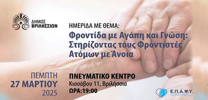Ημερίδα αφιερωμένη στους φροντιστές ατόμων με άνοια διοργανώνει ο Δήμος Βριλησσίων την Πέμπτη 27/3 στις 19:00 στο Πνευματικό Κέντρο, Κισσάβου 11.