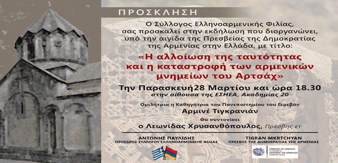 Συγκεκριμένα ο Σύλλογος Ελληνοαρμενικής Φιλίας πραγματοποιεί, υπό την αιγίδα της Πρεσβείας της Δημοκρατίας της Αρμενίας στην Ελλάδα, μια ιδιαίτερα σημαντική εκδήλωση για την καταστροφή και αλλοίωση του πολιτιστικού χαρακτήρα των αρμενικών μνημείων του Αρτσάχ. Λόγω της μεγάλης σημασίας του ζητήματος, προσεκλήθη και θα μιλήσει η ειδικός επί του θέματος, Καθηγήτρια Armine Tigranyan, από το Πανεπιστήμιο του Εριβάν.