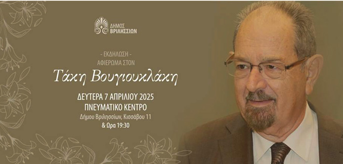 Τέσσερα χρόνια συμπληρώνονται από την απώλεια του Τάκη Βουγιουκλάκη και ο Δήμος Βριλησσίων, η πόλη που έζησε και υπηρέτησε, διοργανώνει μια εκδήλωση αφιερωμένη στη μνήμη και το πολυσχιδές έργο του, στον πολιτισμό και στην αυτοδιοίκηση.