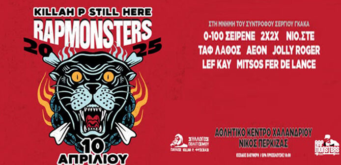 Το Rap Monsters Festival 2025, το μεγάλο αντιφασιστικό φεστιβάλ νεολαίας που διοργανώνεται κάθε χρόνο στις 10 Απριλίου, στα γενέθλια του Παύλου Φύσσα, επιστέφει φέτος στο Χαλάνδρι, τιμώντας και τη μνήμη του πρόσφατα εκλιπόντος Σέργιου Γκάκα, συγγραφέα, σκηνοθέτη και επί σειρά ετών αντιδημάρχου Πολιτισμού του Χαλανδρίου.