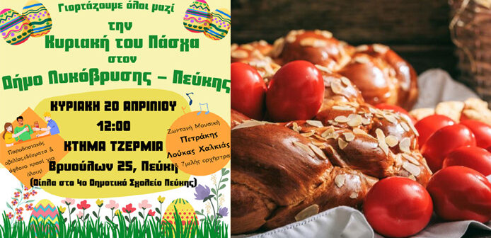 Και φέτος ο Δήμος Λυκόβρυσης – Πεύκης διοργανώνει Πασχαλινό γλέντι στο Κτήμα Τζερμιά, (Βρυούλων 25, Άνω Πεύκη, δίπλα στο 4ο Δημοτικό Σχολείο Πεύκης) την Κυριακή του Πάσχα από τις 12 το μεσημέρι.