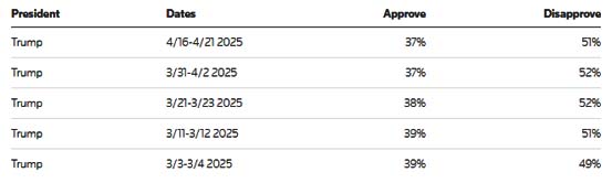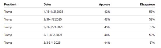 Σύμφωνα με την έρευνα, το 42% του δείγματος εγκρίνει τις επιδόσεις του κ. Τραμπ στο αξίωμα, από 43% σε ανάλογη έρευνα τρεις εβδομάδες νωρίτερα και 47% αμέσως μετά την ορκωμοσία του την 20ή Ιανουαρίου.