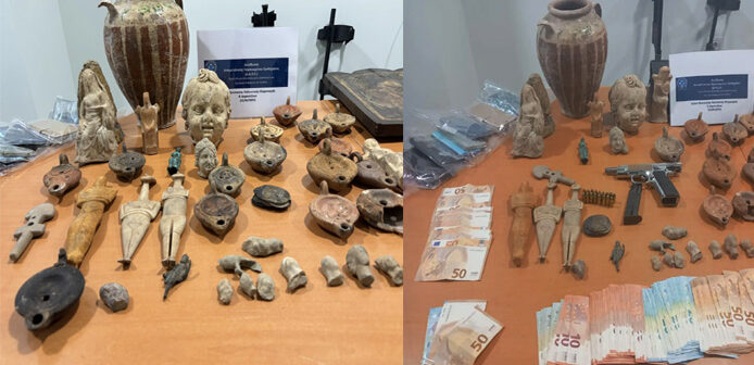 Οι Αρχές εντόπισαν και κατάσχεσαν τουλάχιστον 46 αρχαιότητες, ανάμεσά τους ειδώλια, μαρμάρινη παιδική κεφαλή και αγγεία. Προς το παρόν, δεν είναι σαφής η προέλευση των αρχαίων αντικειμένων.