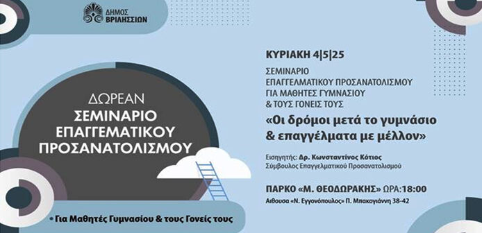 Δωρεάν σεμινάριο επαγγελματικού προσανατολισμού διοργανώνει η Αντιδημαρχία Παιδείας του Δήμου Βριλησσίων με εισηγητή τον Δρ. Κωνσταντίνο Κότιο την προσεχή Κυριακή 4/5 στις 18:00 στην αίθουσα «Νίκος Εγγονόπουλος» του πάρκου Μ. Θεοδωράκης (πρ. ΤΥΠΕΤ).
