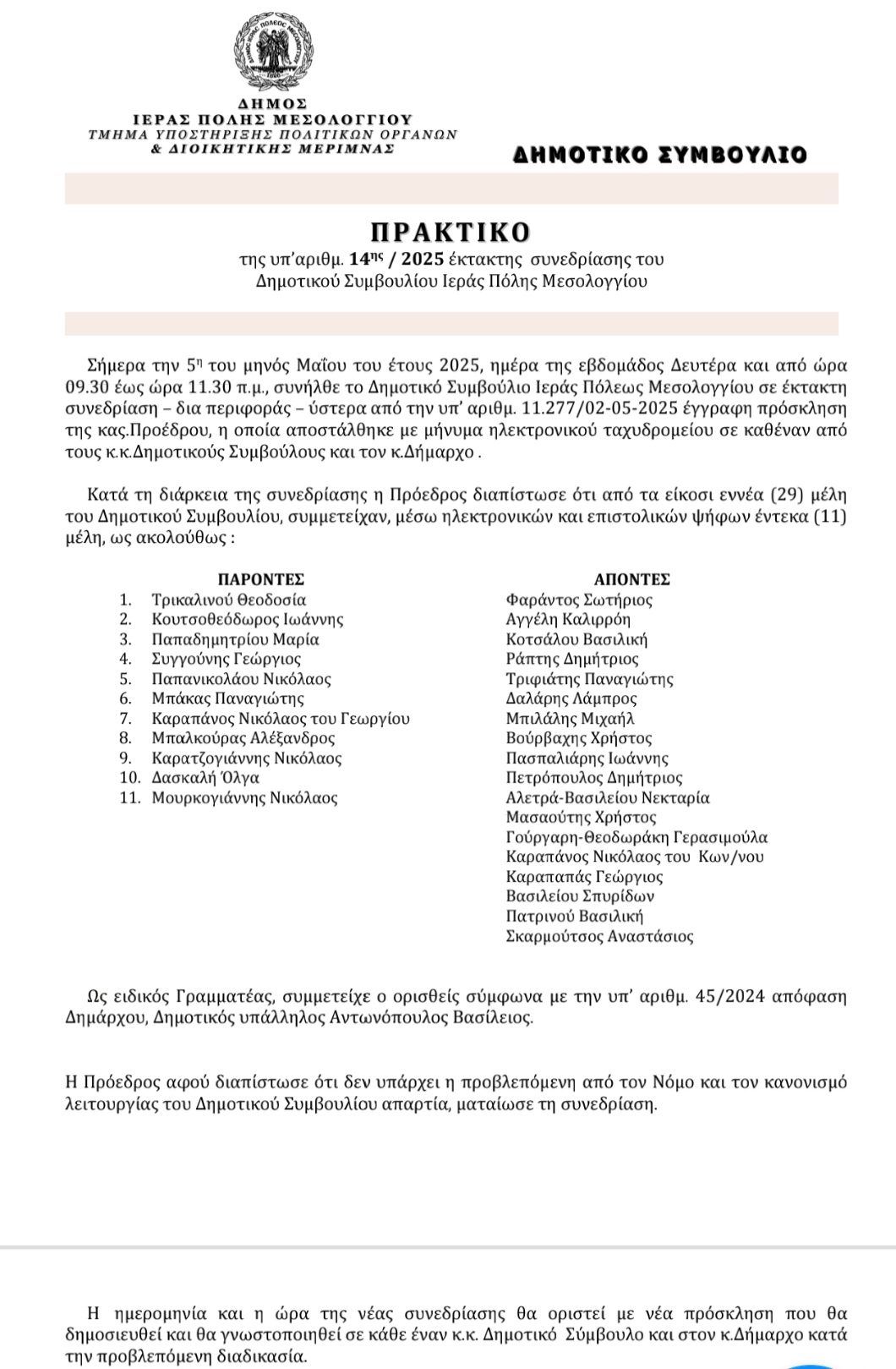 Παρόντες στο Δημοτικό Συμβούλιο ήταν οι: Τρικαλινού Θεοδοσία, Κουτσοθεόδωρος Ιωάννης, Παπαδημητρίου Μαρία, Συγγούνης Γεώργιος, Παπανικολάου Νικόλαος, Μπάκας Παναγιώτης, Καραπάνος Νικόλαος του Κωνσταντίνου, Μπαλκούρας Αλέξανδρος, Καρατζογιάννης Νικόλαος, Δασκαλή Όλγα και Μουρκογιάννης Νικόλαος.