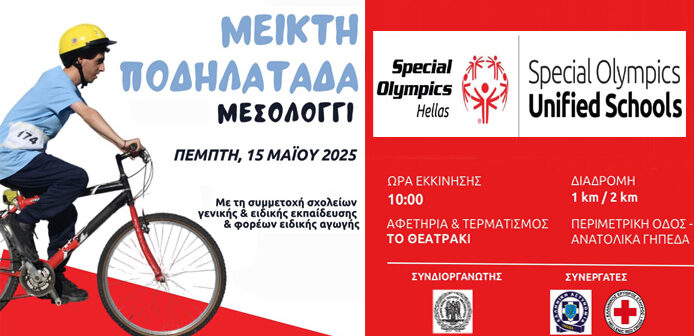Τα Special Olympics Hellas διοργανώνουν μια ξεχωριστή ποδηλατάδα στο Μεσολόγγι την Πέμπτη, 15 Μαΐου 2025, στην οποία μαθητές από σχολεία ειδικής και γενικής εκπαίδευσης, καθώς και ωφελούμενοι από φορείς ειδικής αγωγής θα αγωνιστούν μαζί, στέλνοντας το μήνυμα της Ένταξης και της ισότιμης συμμετοχής.