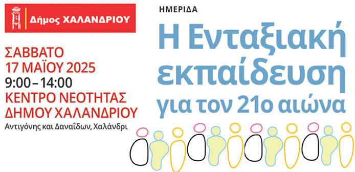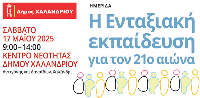 Την ημερίδα «Η Ενταξιακή εκπαίδευση για τον 21ο αιώνα» διοργανώνει ο Δήμος Χαλανδρίου, το Σάββατο 17 Μάϊου 2025, στο Κέντρο Νεότητας (Αντιγόνης & Δαναΐδων), από 09:00 έως 14:00.