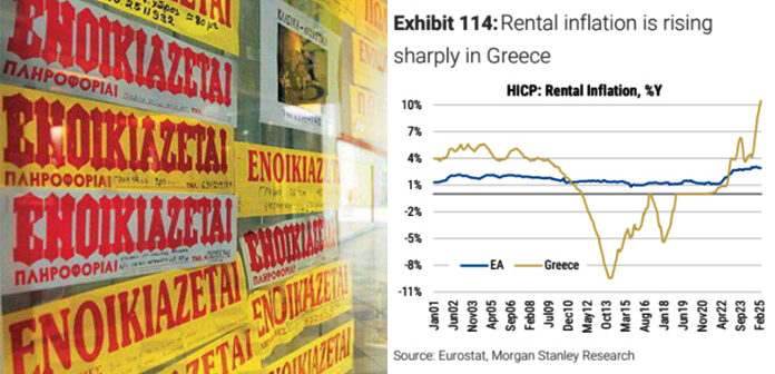 Ο αμερικανικός οίκος Morgan Stanley σε έκθεση του παρουσιάζει τις εκτιμήσεις του σχετικά με την πορεία της ελληνικής οικονομίας, υπογραμμίζοντας το τεράστιο κόστος των ενοικίων. Βάσει στοιχείων ο πληθωρισμός στα ενοίκια ξεπερνάει το 10% ποσοστό τριπλάσιο από το μέσο όρο στην Ευρώπη.