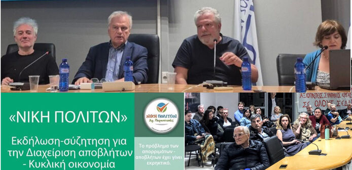 Με επιτυχία πραγματοποιήθηκε, στην γεμάτη πολίτες αίθουσα του Δημαρχείου, η ανοιχτή εκδήλωση – συζήτηση με θέμα: «Διαχείριση Αποβλήτων και Κυκλική Οικονομία», που διοργάνωσε η Ανεξάρτητη Δημοτική Κίνηση «ΝΙΚΗ ΠΟΛΙΤΩΝ Αγ. Παρασκευής»., Η εκδήλωση είχε στόχο να αναδείξει τις πρακτικές λύσεις για τη βιώσιμη διαχείριση αποβλήτων, την ενίσχυση της ανακύκλωσης όπως και την προώθηση της κυκλικής οικονομίας σε τοπικό επίπεδο, με συμμετοχή ειδικών επιστημόνων και ανθρώπων της πράξης., Ο Καθηγητής ΕΜΠ και Δημοτικός Σύμβουλος Χαλανδρίου κ. Γεράσιμος Λυμπεράτος, ανέλυσε τις σύγχρονες προκλήσεις και τις ευκαιρίες που προσφέρει η κυκλική οικονομία (δηλαδή η επαναχρησιμοποίηση και εκμετάλλευση των απορριμμάτων) δίνοντας έμφαση στην ανάγκη για βιώσιμες πρακτικές διαχείρισης των αποβλήτων σε τοπικό επίπεδο., «Οι Δήμοι», τόνισε ο ομιλητής, «οφείλουν να: