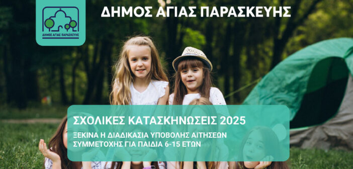 Ο Δήμος Αγίας Παρασκευής θα υλοποιήσει και φέτος το πρόγραμμα Παιδικών Κατασκηνώσεων στο οποίο προβλέπεται η συμμετοχή 85 παιδιών ηλικίας 6 – 15 χρονών (γεννημένα από το (2010-2019).