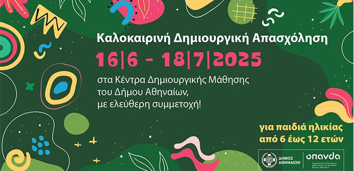 Πέντε εβδομάδες γεμάτες δημιουργία, χαρά και παιχνίδι περιμένουν τα παιδιά ηλικίας από 6 έως 12 ετών (γεννημένα 2013 – 2019), που θα συμμετέχουν στο πρόγραμμα Καλοκαιρινής Δημιουργικής Απασχόλησης, που προσφέρει δωρεάν και αυτό το καλοκαίρι ο Δήμος Αθηναίων, μέσω του Οργανισμού Πολιτισμού, Αθλητισμού και Νεολαίας του Δήμου Αθηναίων, από 16 Ιουνίου έως 18 Ιουλίου 2025 στα Κέντρα Δημιουργικής Μάθησης.