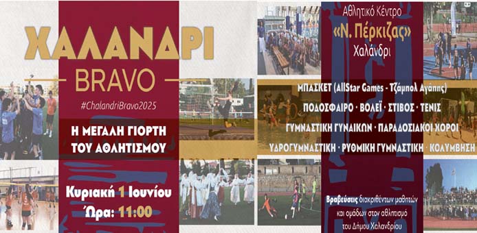 Για τέταρτη συνεχή χρονιά, όλο το αθλητικό Χαλάνδρι ενώνεται και γιορτάζει στη μεγάλη γιορτή «Bravo 2025» που διοργανώνει ο Δήμος Χαλανδρίου, στο Δημοτικό Αθλητικό Κέντρο «Νίκος Πέρκιζας», την Κυριακή 1 Ιουνίου.