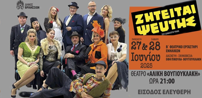 Το Β’ θεατρικό Εργαστήρι του Δήμου Βριλησσίων παρουσιάζει το έργο του Δημήτρη Ψαθά «Ζητείται Ψεύτης» στις 27 και 28 Ιουνίου στις 21:00 στο Θέατρο «Αλ. Βουγιουκλάκη» (Μετ. Σωτήρος και Υψηλάντου, Άνω Βριλήσσια). Η είσοδος για το κοινό είναι ελεύθερη.