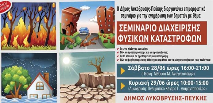 Ο Δήμος Λυκόβρυσης-Πεύκης διοργανώνει επιμορφωτικό Σεμινάριο για την ενημέρωση των δημοτών, με θέμα: «Σεμινάριο Διαχείρισης Φυσικών Καταστροφών»