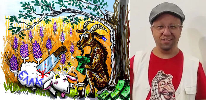 Αντ’ αυτού, βρέθηκε με ένα …χασαπομάχαιρο στην πλάτη. Δίπλα του, ένα γίδι εμφανώς χορτάτο και εμφανέστατα… “γαλάζιο”, καταβροχθίζει πακέτα με ευρώ και πίνει φραπέ σε πλαστικό, γιατί η κοροϊδία δεν είναι ποτέ zero waste.