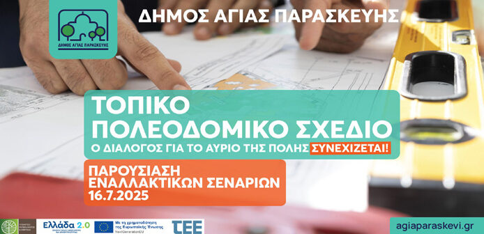 Η Δημοτική Αρχή του Δήμου Αγίας Παρασκευής απευθύνει ανοικτό κάλεσμα σε δημότες και φορείς για τη συμμετοχή τους στην εκδήλωση παρουσίασης των εναλλακτικών σεναρίων Χωρικής Ανάπτυξης του 1ου Σταδίου της μελέτης του Τοπικού Πολεοδομικού Σχεδίου (ΤΠΣ) του Δήμου Αγίας Παρασκευής.