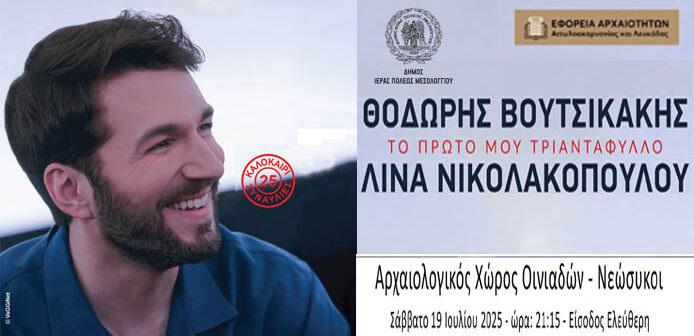 Τον Θοδωρή Βουτσικάκη και την Λίνα Νικολακοπούλου υποδεχόμαστε στο Νεώριο Οινιαδών, για μια ξεχωριστή συναυλία με τίτλο «Το πρώτο μου τριαντάφυλλο» που συνδιοργανώνει ο Δήμος Ιερής Πόλης Μεσολογγίου και η Εφορεία Αρχαιοτήτων Αιτωλοακαρνανίας & Λευκάδας, με ελεύθερη είσοδο για όλους, το Σάββατο, 19 Ιουλίου 2025 στις 21:15.