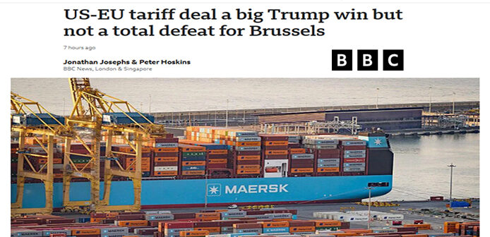 - Διαβάστε από το πρωτότυπο το άρθρο των δημοσιογράφων Jonathan Josephs & Peter Hoskins, του BBC, με τίτλο «US-EU tariff deal a big Trump win but not a total defeat for Brussels», πατώντας ΕΔΩ