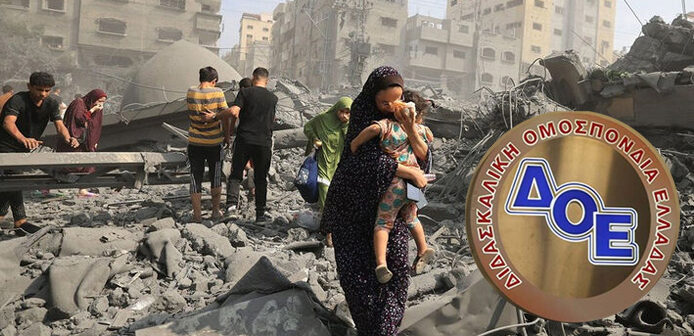 Η 94η Γενική Συνέλευση της Διδασκαλικής Ομοσπονδίας Ελλάδος ζητά να σταματήσει τώρα ο πόλεμος και η επιχείρηση του Ισραήλ με σκοπό την κατοχή της Λωρίδας της Γάζας. Παράλληλα, εκφράζει τη συμπαράστασή της στον διαρκή αγώνα του παλαιστινιακού λαού και ζητά να εφαρμοστεί η απόφαση της Γενικής Συνέλευσης του ΟΗΕ από το 1988 με το ψήφισμα 43/177, το οποίο αναγνωρίζει την ανακήρυξη του ανεξάρτητου κράτους της Παλαιστίνης στα σύνορα του 1967, καθώς και η ομόφωνη απόφαση της ελληνικής Βουλής το 2015.