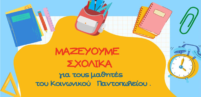 Με αφορμή την έναρξη της νέας σχολικής χρονιάς, ο Αντιδήμαρχος Κοινωνικής Προστασίας και Διοικητικών Υπηρεσιών του Δήμου Ιερής Πόλης Μεσολογγίου Δημήτρης Ράπτης, σε συνεργασία με τα στελέχη των κοινωνικών δομών του Τμήματος Πρόνοιας, καλεί ιδιώτες, συλλόγους, και επιχειρήσεις να συμβάλλουν στην συγκέντρωση σχολικών ειδών για τους μαθητές του Κοινωνικού Παντοπωλείου που χρήζουν στήριξης.