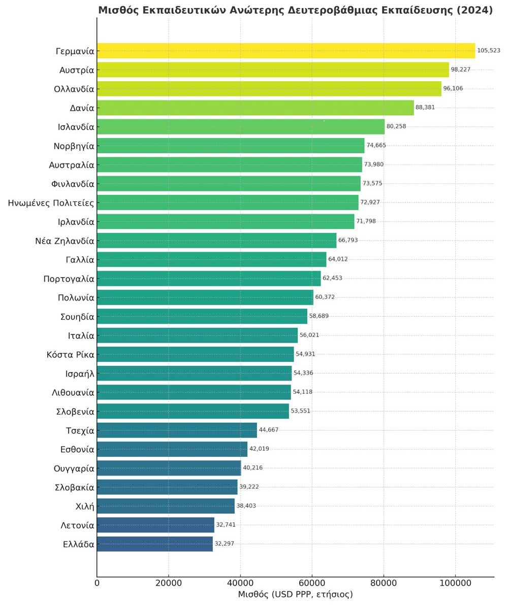 Στην έκθεση που αφορά το έτος 2024, η Ελλάδα κατακτά για πρώτη φορά καθαρά την τελευταία θέση στους μισθούς των εκπαιδευτικών ανώτερης δευτεροβάθμιας εκπαίδευσης μεταξύ όλων των χωρών του ΟΟΣΑ για τις οποίες υπάρχουν στοιχεία.