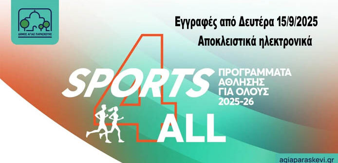Ξεκινούν τη Δευτέρα 15 Σεπτεμβρίου τα «Sports 4 All – Προγράμματα Άθλησης για Όλους» του Δήμου Αγίας Παρασκευής, ανανεωμένα και εμπλουτισμένα, με στόχο να καλύψουν ένα ευρύ φάσμα αθλημάτων για όλες τις ηλικίες και να ανταποκρίνονται στις ανάγκες και τα αιτήματα των κατοίκων.
