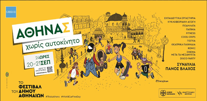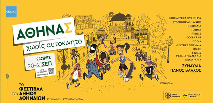 Η Παγκόσμια Ημέρα Χωρίς Αυτοκίνητο (22 Σεπτεμβρίου) γίνεται αφορμή για μια μεγάλη ανοιχτή γιορτή στο κέντρο της πρωτεύουσας. Για 24 ώρες, από το Σάββατο 20 Σεπτεμβρίου στις 20.00, έως τις 22.00 βράδυ της Κυριακής 21 Σεπτεμβρίου, το Φεστιβάλ του Δήμου Αθηναίων μεταμορφώνει την οδό Αθηνάς – από την Ευριπίδου έως το Μοναστηράκι – σε έναν ζωντανό χώρο πολιτισμού, άσκησης, παιχνιδιού και δημιουργίας, χωρίς αυτοκίνητα και μηχανάκια.
