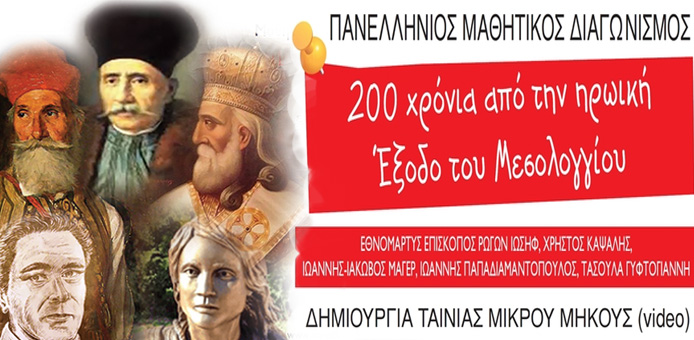 Η Γενική Γραμματεία Θρησκευμάτων του Υπουργείου Παιδείας, Θρησκευμάτων και Αθλητισμού και η Ειδική Συνοδική Επιτροπή Πολιτιστικής Ταυτότητος της Ιεράς Συνόδου της Εκκλησίας της Ελλάδος διοργανώνουν πανελλήνιο μαθητικό διαγωνισμό δημιουργίας ταινίας μικρού μήκους (βίντεο) με θέμα: «Η ηρωική έξοδος των Ελευθέρων Πολιορκημένων του Μεσολογγίου το 1826» με αφορμή τη συμπλήρωση 200 ετών από το ιστορικό γεγονός.