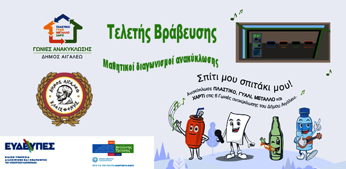 Η δημιουργικότητα, η συνεργασία και η περιβαλλοντική συνείδηση των μαθητών βρίσκονται στο επίκεντρο της Τελετής Βράβευσης των σχολείων που διακρίθηκαν στους μαθητικούς διαγωνισμούς, στο πλαίσιο του έργου «Ολοκληρωμένο Πρόγραμμα Γωνιών Ανακύκλωσης στο Δήμο Αιγάλεω».