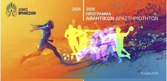Από τη Δευτέρα 06/10/2025 ξεκινούν οι εγγραφές στα Προγράμματα Αθλητισμού του Δήμου Βριλησσίων 2025-2026.