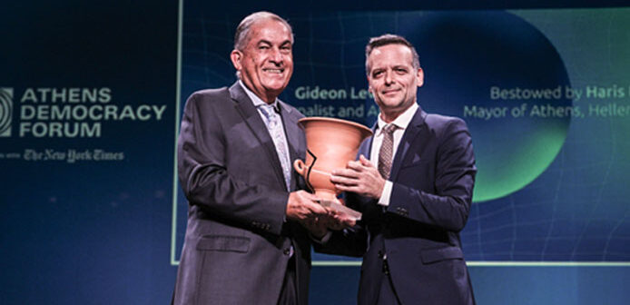 Το Βραβείο Δημοκρατίας 2025 απένειμε ο Δήμαρχος Αθηναίων, Χάρης Δούκας, στον Ισραηλινό δημοσιογράφο και συγγραφέα, Γκίντεον Λέβι, κατά τη διάρκεια τελετής, που πραγματοποιήθηκε την Τετάρτη 1 Οκτωβρίου, στο Ολύμπια, Δημοτικό Μουσικό Θέατρο «Μαρία Κάλλας».