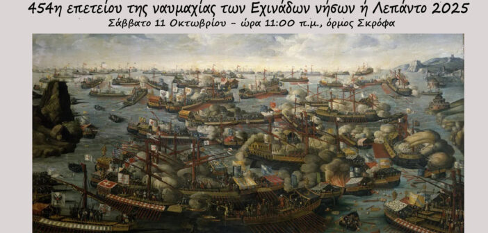 Οι εκδηλώσεις μνήμης, που περιλαμβάνουν επιμνημόσυνες δεήσεις για τους πεσόντες στην Ναυμαχία, θα πραγματοποιηθούν το Σάββατο 11 Οκτωβρίου και ώρα 11:00 π.μ., στον ιστορικό τόπο που διεξήχθη η ναυμαχία, στον όρμο Σκρόφα – περιοχή ΙΧΘΥΚΑ Οινιαδών.